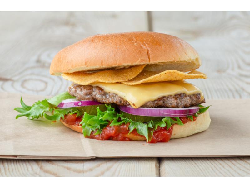 Juicy homestyle burger i briochebrød, med salsa, salat, tomat, agurk. Toppet med ost og nachos.