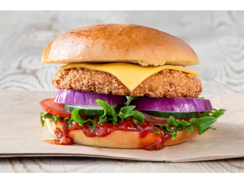 Juicy og sprø Kyllingburger av kyllingfilet i Briochebrød. Med ost, relish, crispysalat, tomat, agurk og rødløk.