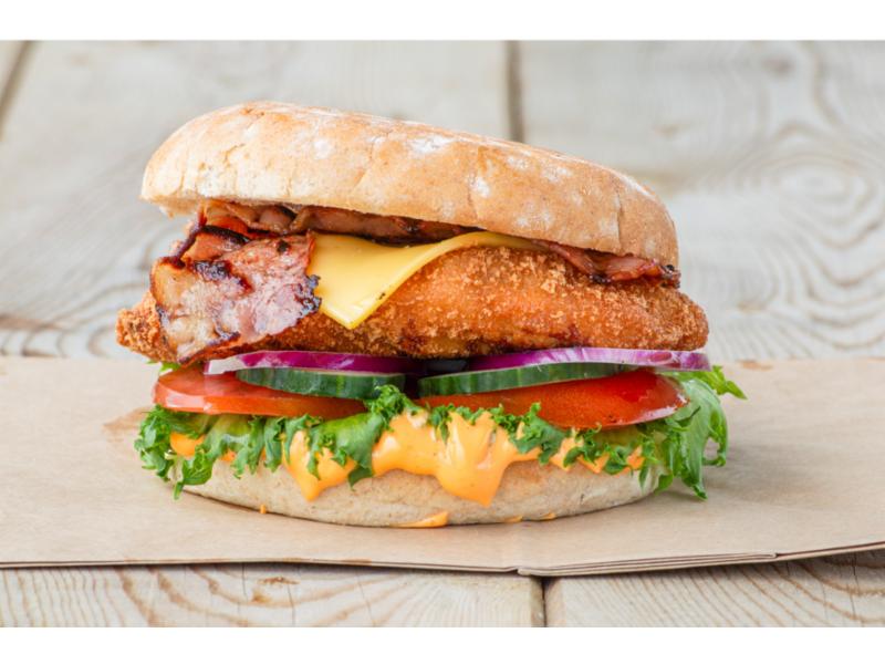 Crunchy og juicy hel kylling brystfilet i goumetbrø. Med spicy mayodressing, salat, tomat, agurk og rødløk. Toppet med Ost og Bacon.