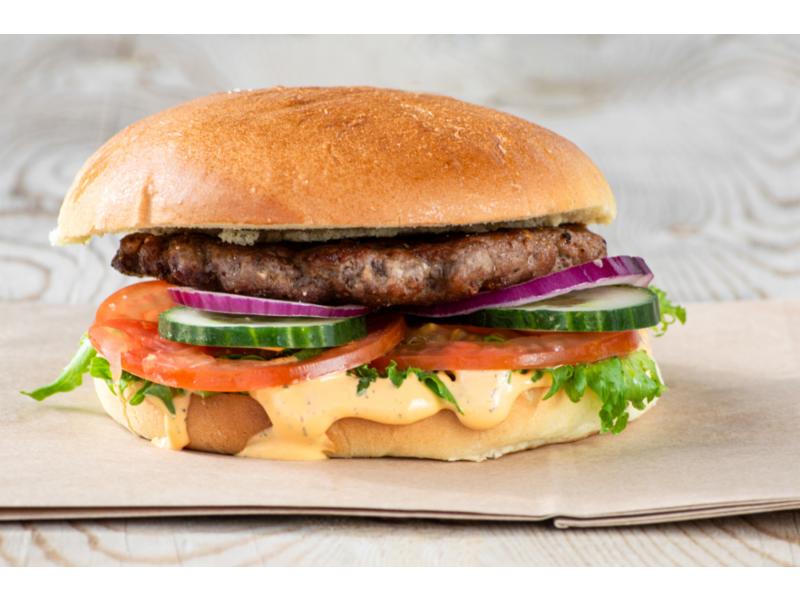 Juicy Homestyle burger i briochebrød, med klassisk hamburgerdressing, salat, tomat, agurk og rødløk.