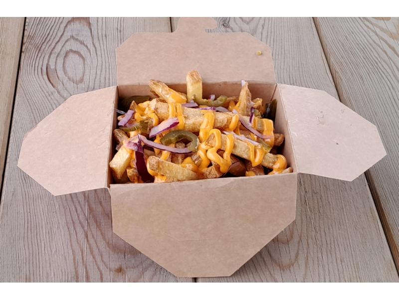 Sprø Fries med rødløk, jalapenos og spicy mayodressing.