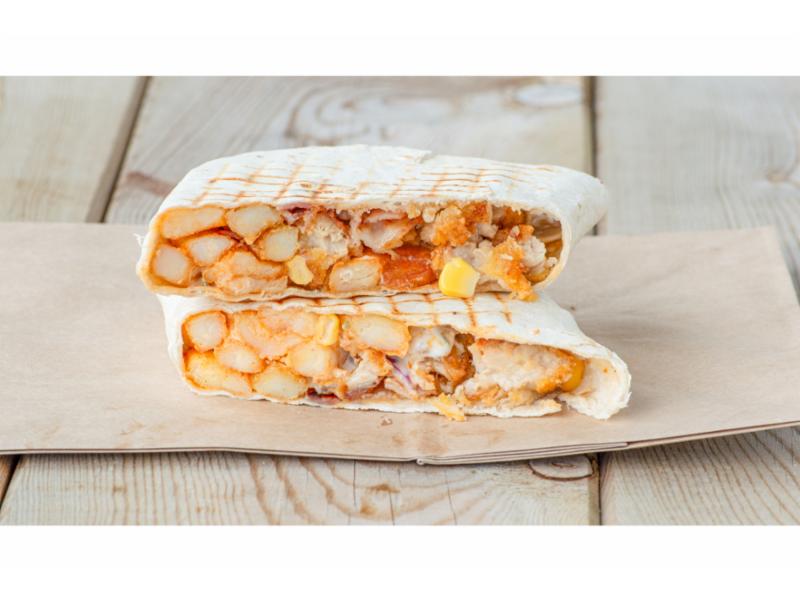 Toastet tortilla med sprø kylling. Fylt med hvitløksdressing, bacon, rødløk og mais. Toppet med smakfull revet parmesan.