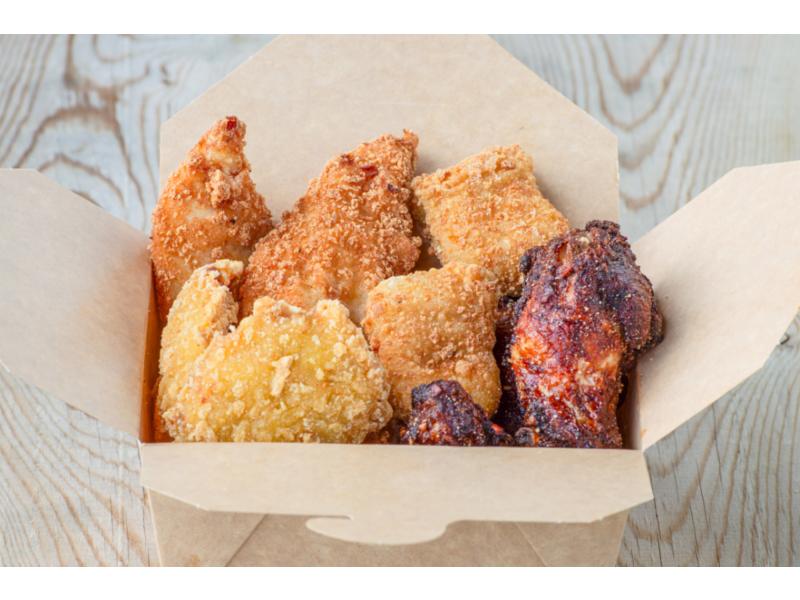 Utvalg av friterte kyllingbiter. 4x Nuggets 4x Buffalo Wings 4x Boneless leg Bites 2x Tenders