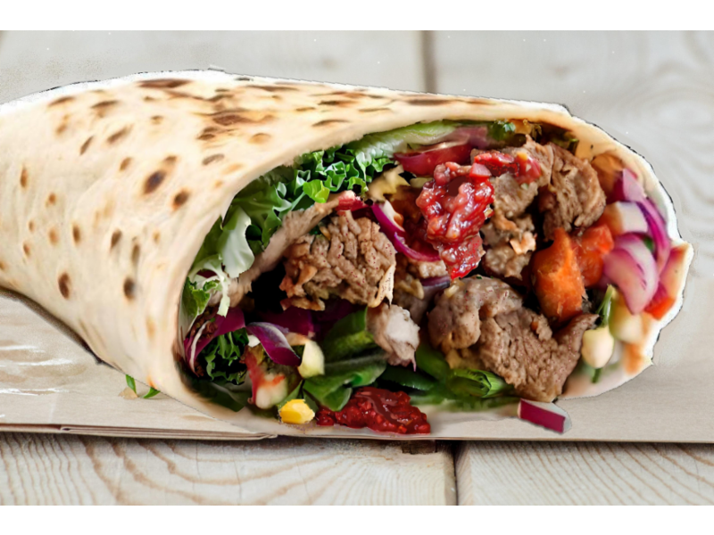 Wrap med crispy salat, tacokjøtt, tomat, rødløk, mais og salsasaus