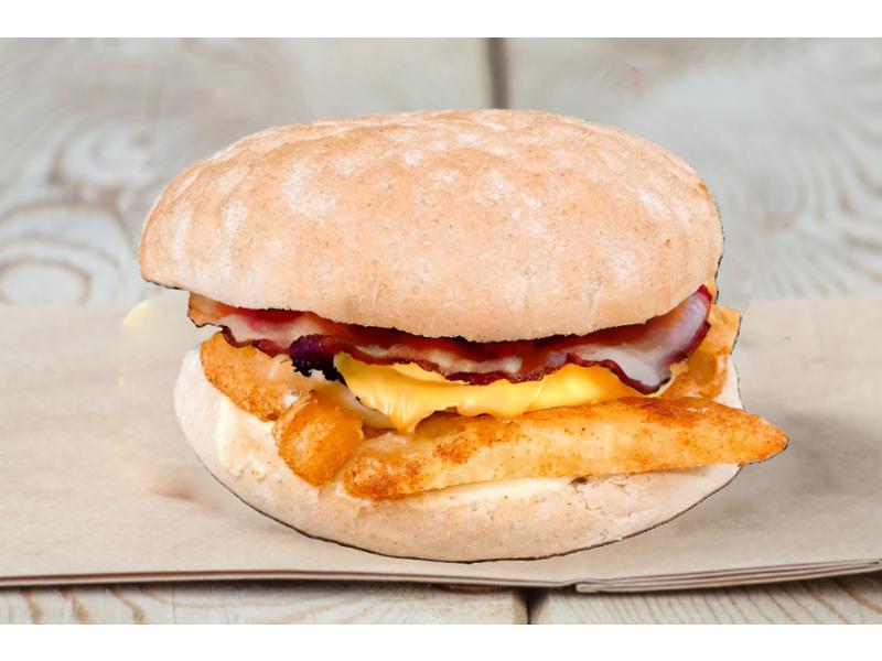 Sandwich med remulade, fries, løk, mais, ost og bacon.