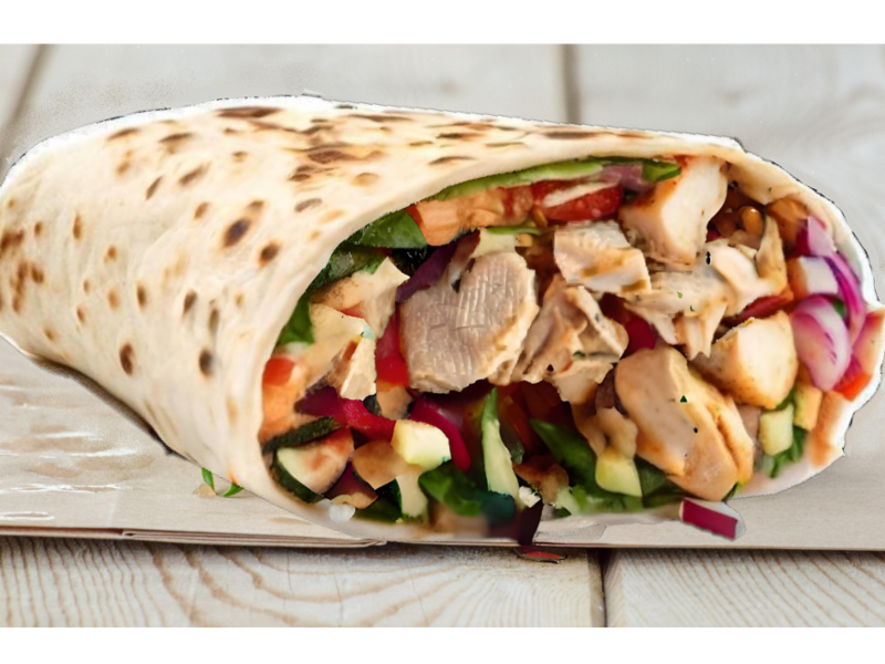 Wrap med slicet fritert kyllingkjøtt, crispy salat, tomat, agurk, rødløk, mais og deilig indisk currydressing. Toppet med spicy mangosaus.