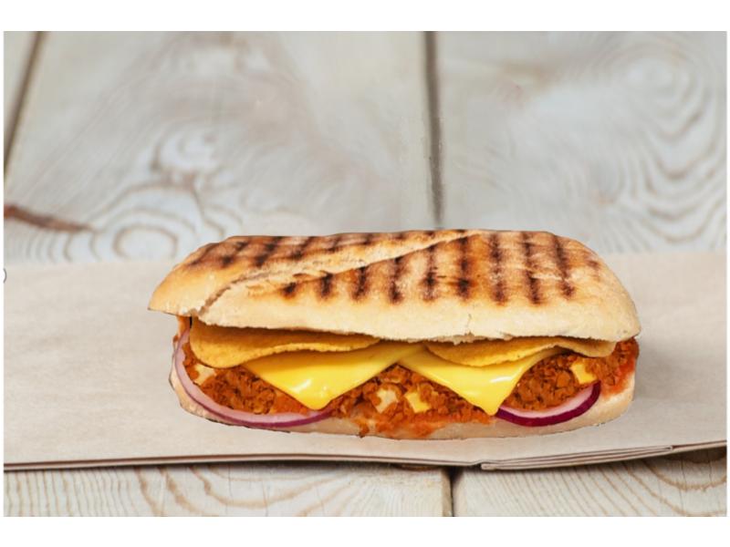 Sandwich med tacokjøtt, salsar, rødløk, mais, ost og Tortillachips.